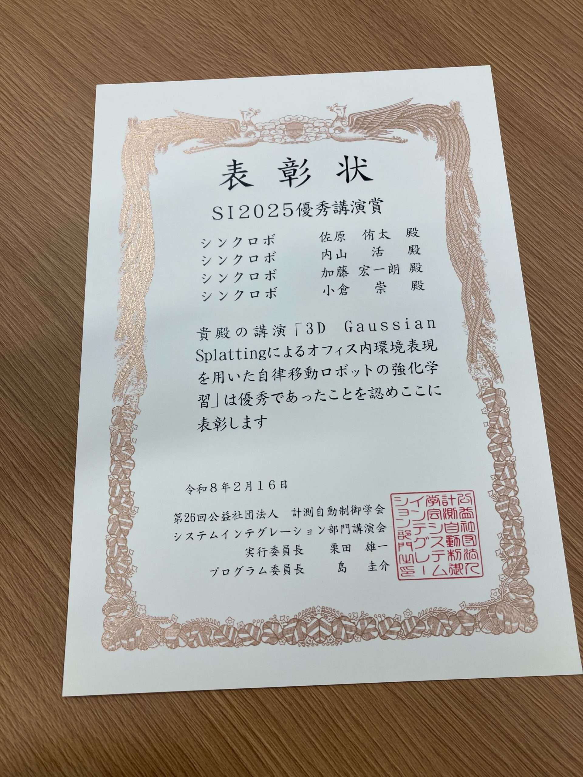 2025年12月に開催された「SI2025(第26回システムインテグレーション部門講演会)」において、弊社の発表が「優秀講演賞」に選出され、この度賞状を受領いたしました。